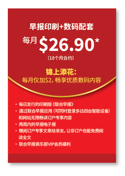 早报印刷+数码 配套 $26.90*/月 |